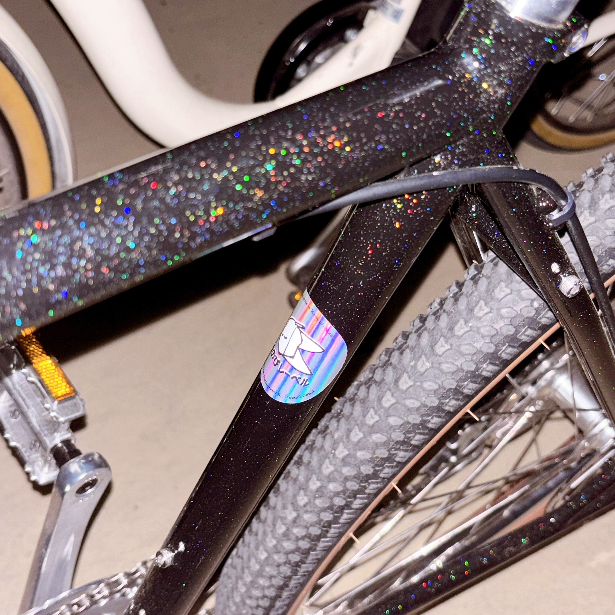 光の当たり方でカラフルに輝くホログラムですが、マット加工をしているので、ギラギラし過ぎないのがこだわりポイント(地味に原価高い…)。